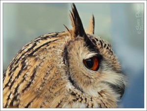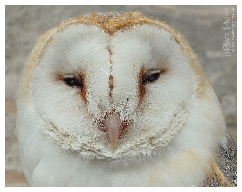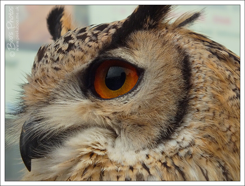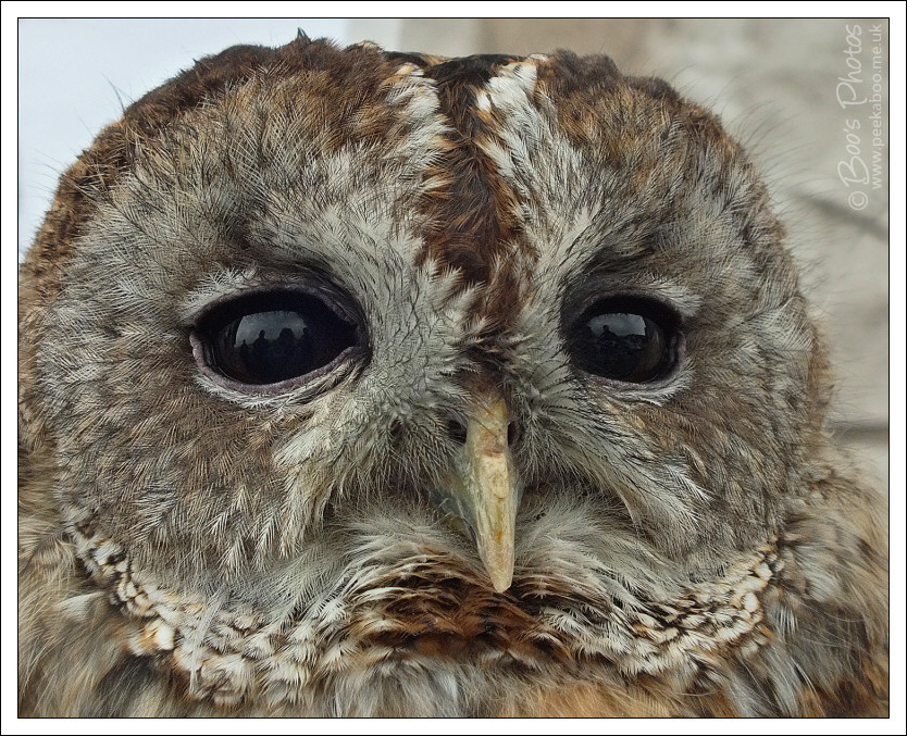 There were 4 owls with him, ranging in size, from the tiny 8″ tall Tropical Screech Owl (who don’t actually screech apparently, but he did chatter at things that annoyed him – like passing dogs and crows) called Olly, Sky the barn owl, Cuddles a Tawny Owl and the largest Bengali Owl called Elmo. I asked if I could take a few photographs and he said yes, which was such a joy to have the opportunity of getting so close. Unfortunately, they were outside the main entrance of a modern-built out of town superstore, which was plastered with signs, posters and a burglar alarm – so the background was somewhat unnatural and distracting, so I’ve largely framed in very tight on their faces.