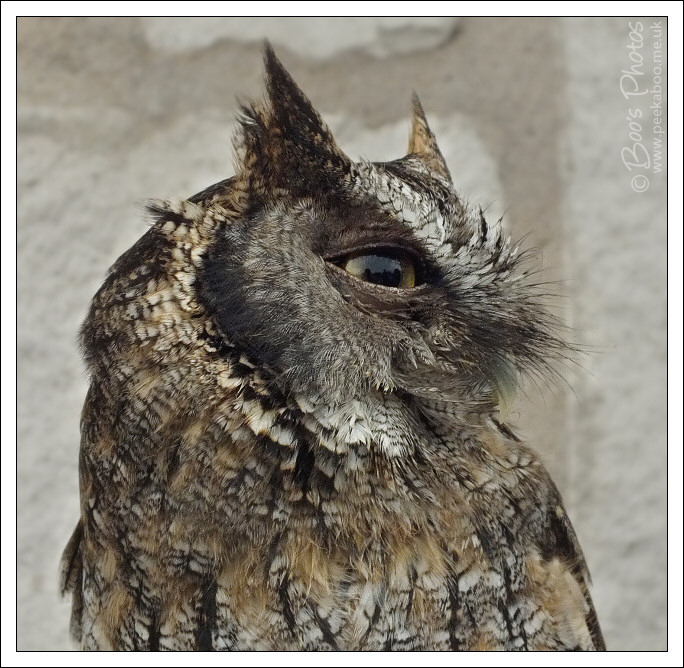 Cuddles was clearly distracted by something above him, he periodically looked skywards and turned his head around, as though being vigilant about some perceived threat from above – I asked if it was the car park crows that concerned him, but apparently, the burglar alarm box above them on the wall periodically emitted a high pitched sound that we humans couldn’t hear, but clearly Cuddles, with his super-efficient hearing (Tawny’s have the best hearing of our domestic owls, hence the ear-demo) could hear it and wasn’t sure what to make of it or quite where it was coming from.