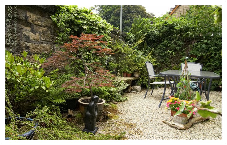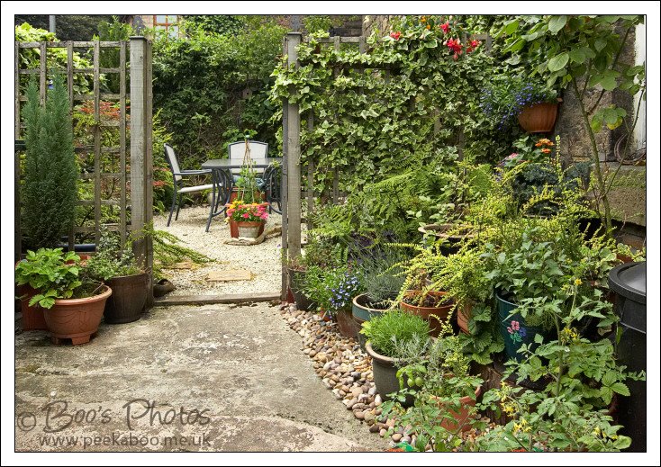 An overall view of the garden, divided into two areas; the closer section as a more utility area, where we keep the bins, hang washing out and I do my gardening work and the farther seating garden. It’s the nearest thing I have to a dining room.