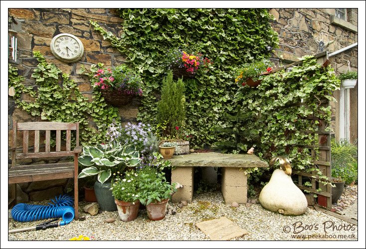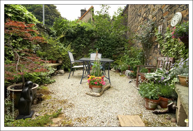 Everything is grown in pots – the original concrete base is still there, but was of such poor quality, we bought a great pile of small grade decorative gravel and just covered it. The colour has faded over the years and there’s a lot of moss growing on it now, but it has withstood wear better than we expected. Because everything is grown in a pot, we can largely move the smaller things round, but the down side is that some plants don’t do as well as they would in open ground, so we probably don’t get as many years from a plant. But if you pay five pounds for a plant and you enjoy it for 2 years, you can’t really complain at the value it represents.