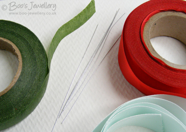 My personal criteria when working the first roses, was to make something with a short flexible stem, just long enough to allow it to be tied into ribbon as an extra decoration on my jewellery packaging. If you want the stems longer or more rigid, you’ll need to fix a length of wire to the rosebud before the final wrap of green florists’ tape.