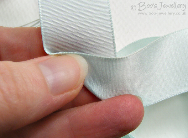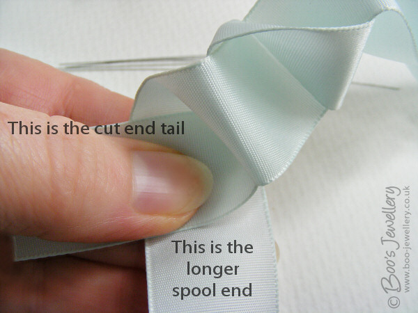 The roses shown in my photographs were all made with a length of ribbon very approximately 12 times as long as it is wide. So if your ribbon is 25mm (1″) wide, you’ll use a piece approximately 300mm (12″) long for each finished rose – but you’ll need a piece twice this length initially to form the rose, more below. The longer the ribbon you use, the fuller the resulting bloom will be.