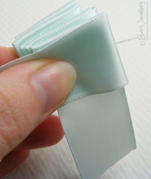 I finish when I have a little tail left of the cut end, projecting beyond the square folds, as this gives you a little tab to hold onto and will be useful later for something else. Make one last fold of the spool end of your ribbon to be the last in the pile. You should have a Christmas garland style concertina of folded ribbon beneath your thumb. It isn’t necessary to keep hold of this folded length, as such, as it holds its shape anyway.