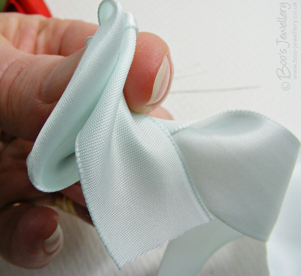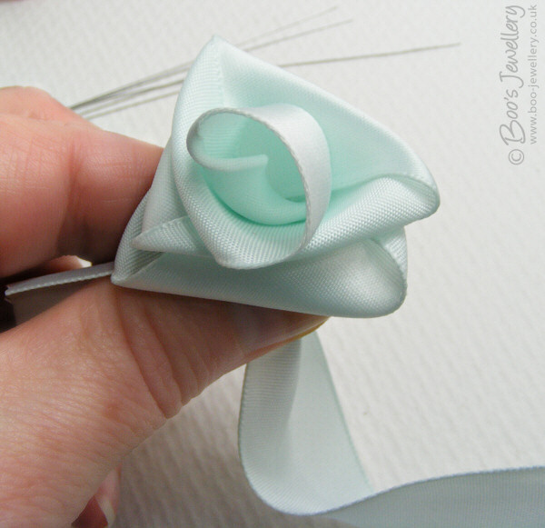 Most rosebud tutorials using this methodology recommend that you start with a particular cut length of ribbon. But the technique requires that you need half of the ribbon for making the shape, but once formed, it’s cut off, surplus to requirements – discarding over 40% of your starting piece each time – too small to make another rose. I thought this was pointlessly wasteful, so I’ve worked from one end of my length of ribbon, only cutting it once the rose was formed and I was happy with it. So if you’re going to work this way, unravel a little spare before starting to give you room to manoeuvre.