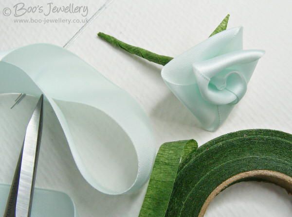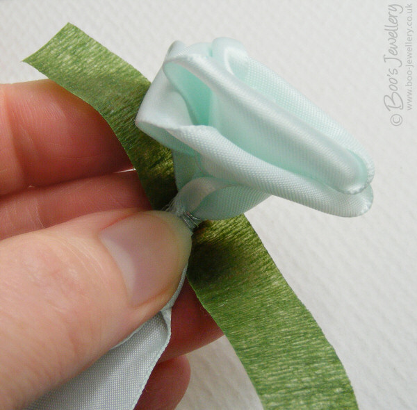 At this point I tend to cut the ribbon from the spool a couple of inches (50mm) below the rosebud, at an angle. This short length of ribbon will become a soft, tapering stem, once wrapped with florists tape.