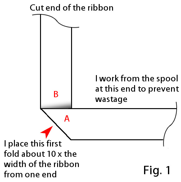 Approximately measure your ten times width along the ribbon length, from the cut end and hold the ribbon vertically in front of you (cut end at the top) and fold up the bottom half (joined to the spool or at least the rest of the ribbon) and to the right to make an L shape at your measured point. See Fig. 1 above. If your ribbon has a clear right and wrong side, hold the wrong side towards you – although ultimately is doesn’t make much difference as you’ll see both sides in the finished rosebud.