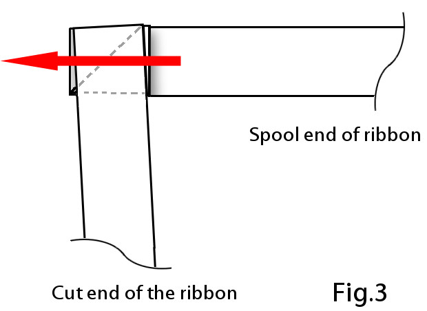 Fold the cut length of the ribbon down vertically from top to bottom over the triangle of ribbon – as indicated by the red arrow and at the dotted line in fig.2. Your next fold is to bring the spool end of the ribbon over the top of it, from right to left, see fig. 3 below.