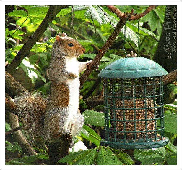 We have a handful of grey squirrels that visit our bird feeders regularly and we put food for them in their own box too. He must have been having his own breakfast when something caught his eye – I suspect it was a neighbour’s cat, as later he went up a bit higher and was swearing quite profusely at her sitting in the garden beneath him.