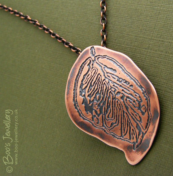 I wanted to keep the plain border of copper sheet beyond the etching to a minimum and parallel to the leaft outline, but didn’t want to drill a hole through the etching either, for various reasons, so this would require fixing something invisibly on the back to hang it from. I didn’t really want to use a tube bail, as I have in the past, as I wanted to put it on a chain with quite a large clasp and a tube bail works best on fine chains with in-line clasps like snake chains.