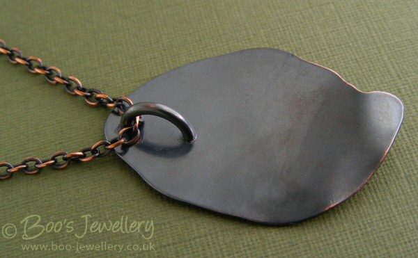 So a soldered D shaped hoop on the back was the obvious solution, I could make it easily in whatever size I wanted to accommodate the clasp. My usual practice when soldering, especially in silver, is to use my own cut strip solder pallions, but I’d recently bought some solder paste to try and have found this especially good with copper, but less so with Sterling. The texture and workability of the paste allowed me to get a nice neat join and I was delighted that it took oxidising so well – as an Easy paste I didn’t expect it to. So I left the back of the pendant with a dark gunmetal finish as a potential alternative way to wear it.
