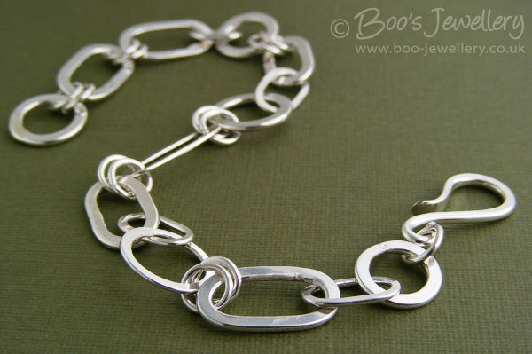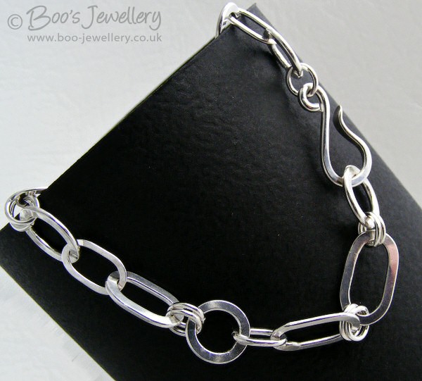 Thus over time, I’d accumulated numerous silver ‘rings’ that had the potential to be re-worked or rescued in some manner and the idea formed some time ago, to make these good, in between other work, to make myself a Sterling silver bracelet. So I started working on sorting some of them out and soon had a dish of assorted links for a bracelet. I made some new smaller links from those that couldn’t be made decent and supplemented these with some new jump rings (some indeed cut individually from scrap itself) and a hook to bring it all together. I wanted to finish it to wear at Christmas and didn’t really have the time to do it properly, so rather rushed the finishing.